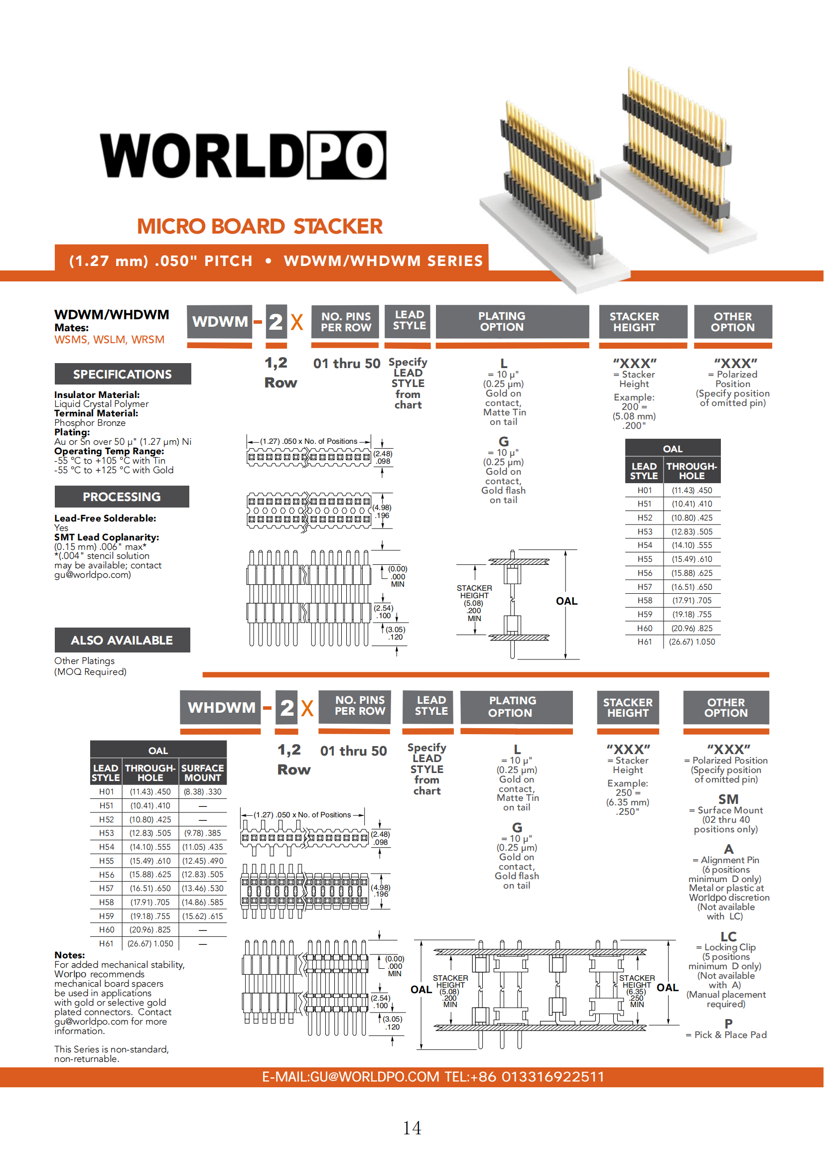 WDWM/WHDWM系列连接器提供单排或双排设计,可选顶针,支持多达100个端子,间距为1.27mm,排数为1排或2排,组装方向垂直,针位数从1Pin至100Pin。特殊功能包括锁紧卡箍选项,以满足极高的耐用性要求。