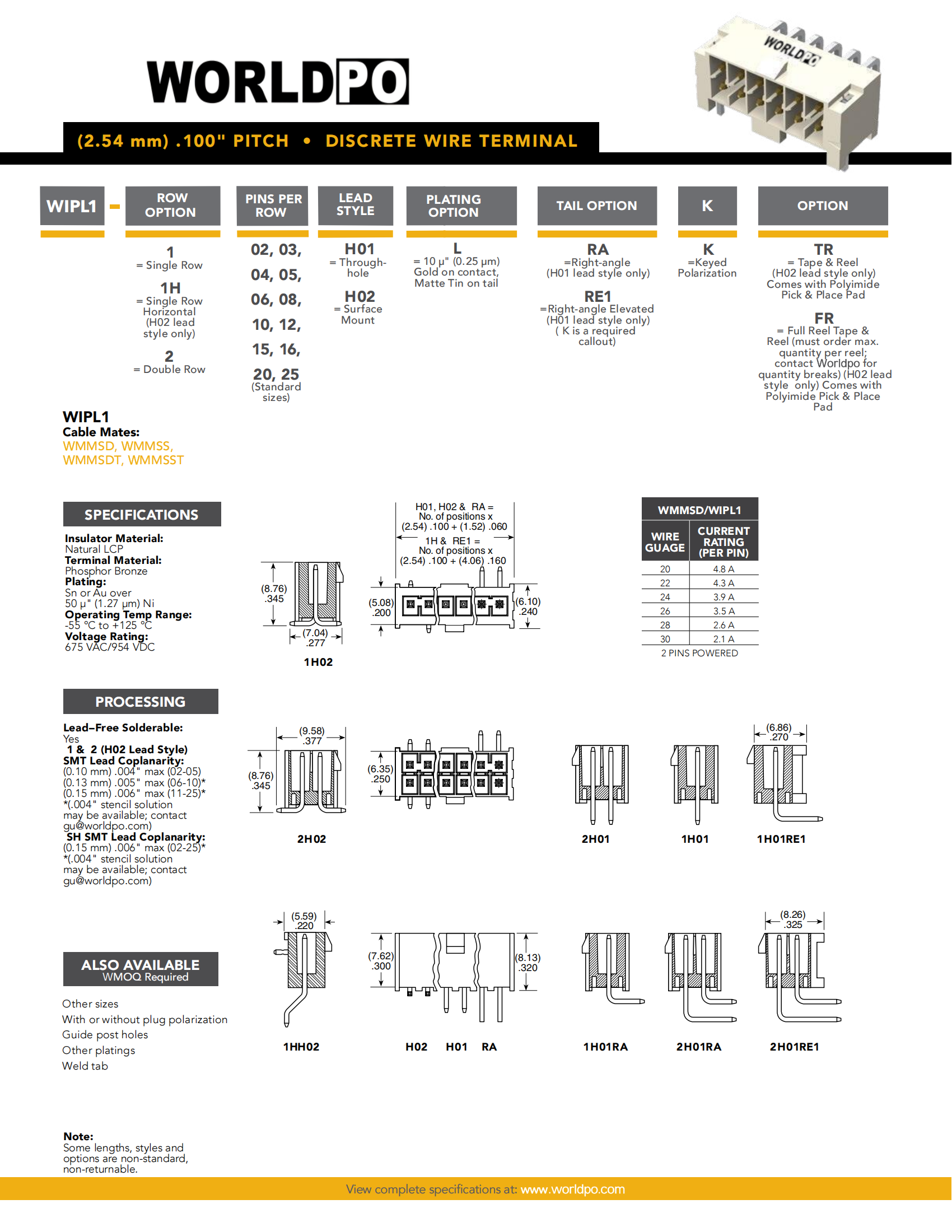 WIPL1系列连接器采用2.54mm间距,提供1排或2排配置,针位数从2Pin到50Pin不等。该连接器支持表面安装和通孔式终端,具有耐高温外壳和闭锁系统,确保安全对接。镀金层厚度为10 µ",在95°C下电流额定值可达3.8 A,适用于垂直或水平表面安装,并提供独立带护罩端子,支持垂直、直角和直角加高通孔安装方式。